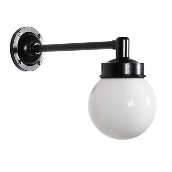Hoflaterne Anton gerade 90 mit mattschwarzem Rohr und Halterungen. Opal weiße Glaskugel, die 18 cm im Durchmesser ist.