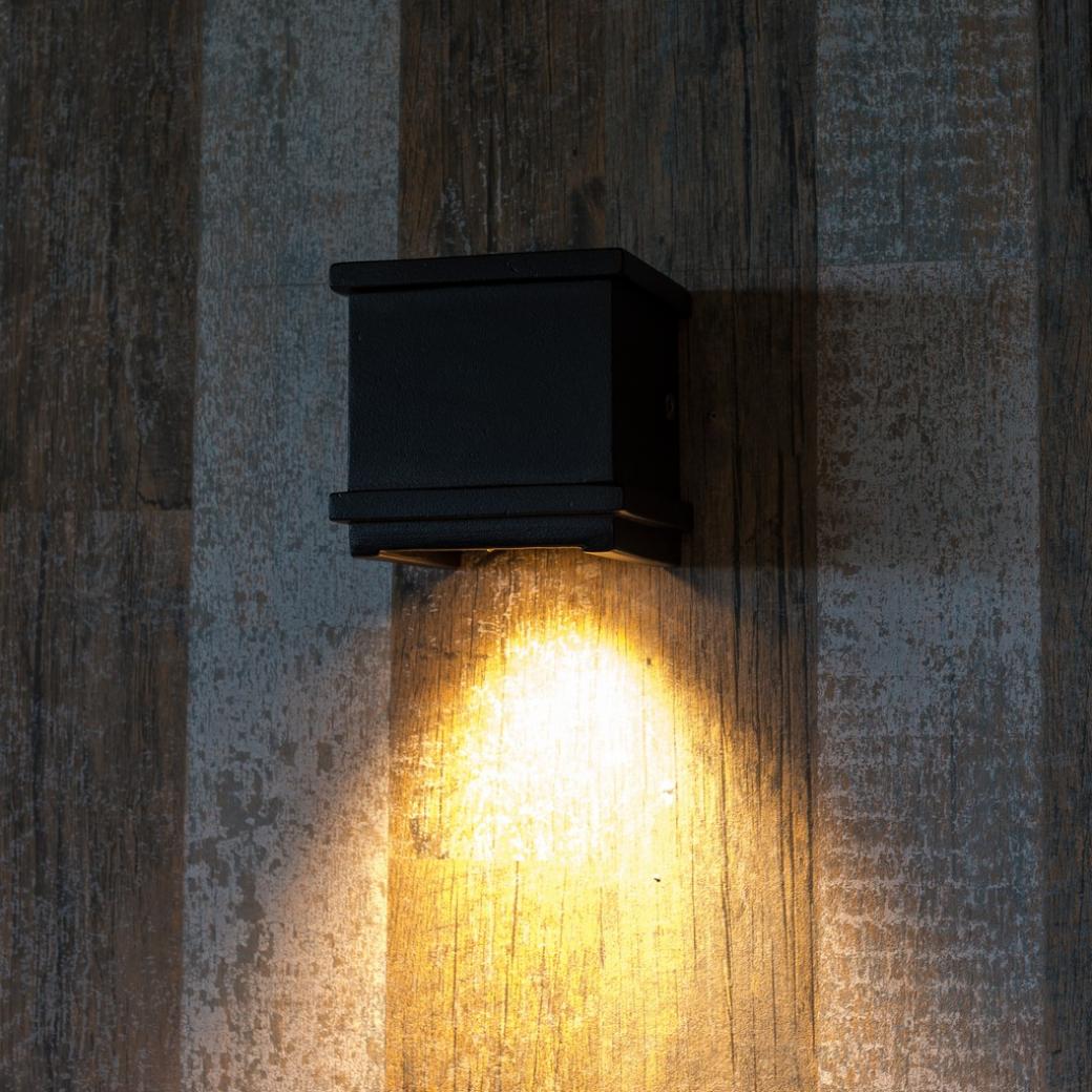 Robuste Wandbeleuchtung, Downlight. Der Lichtaustritt nach unten erzeugt einen markanten Glanz auf der Fassade oder der Diele. Mit ihrem stilvollen und schlichten Design wird diese Beleuchtung auch zu einem Schmuckstück an Ihrer Fassade.