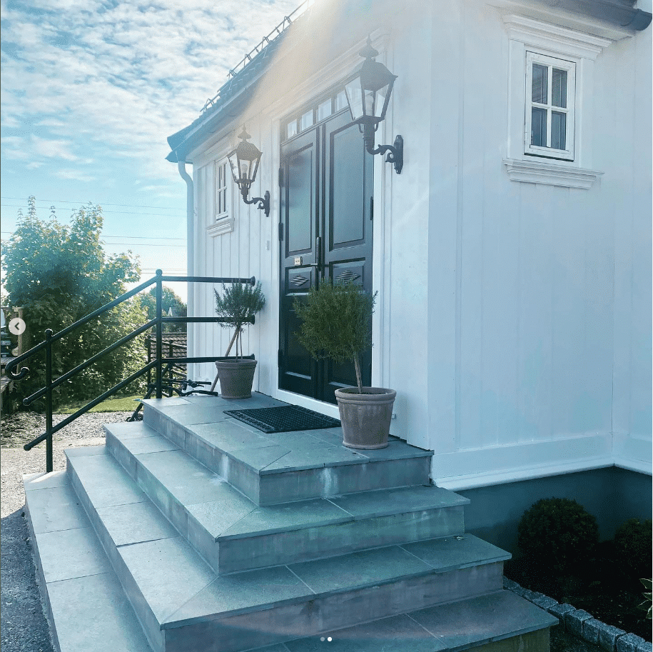 Schöne Sundre-Fassadenlaterne neben den schönen Doppeltüren mit Oberlicht!