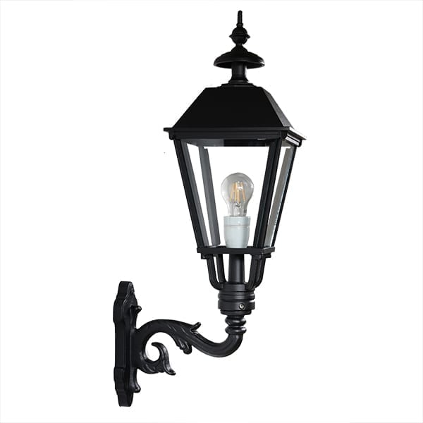 Unsere Außenlampe hat eine 4-eckige Laterne mit einer schönen Turmspitze. Echtes Glas gibt ein schönes Lichtbild wieder. Die geschwungene handgegossene Wandhalterung wird mit dem Laternenhaus zu einem edlen Schmuckstück an Ihrer Fassade, eine Fassadenbeleuchtung, die in ihrem schlichten und unverfälschten klassischen Design die Blicke auf sich zieht. Die klassische Wandleuchte hat einen Porzellansockel mit E27-Fassung, es ist auch möglich, LED in unseren Leuchten zu verwenden.