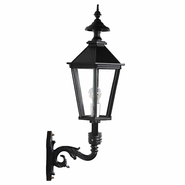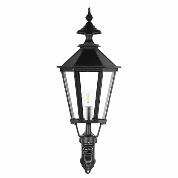 Die Fassadenbeleuchtung ist sechseckig und hat echtes Glas, das ein schönes Lichtbild wiedergibt. Die geschwungene, handgegossene Wandhalterung wird mit dem Laternenhaus zu einem edlen Schmuckstück an Ihrer Fassade, eine Wandleuchte, die in ihrem schlichten und echten klassischen Design die Blicke auf sich zieht. Die klassische Wandleuchte hat einen Porzellansockel mit E27-Fassung, es ist auch möglich, LED in unseren Leuchten zu verwenden.