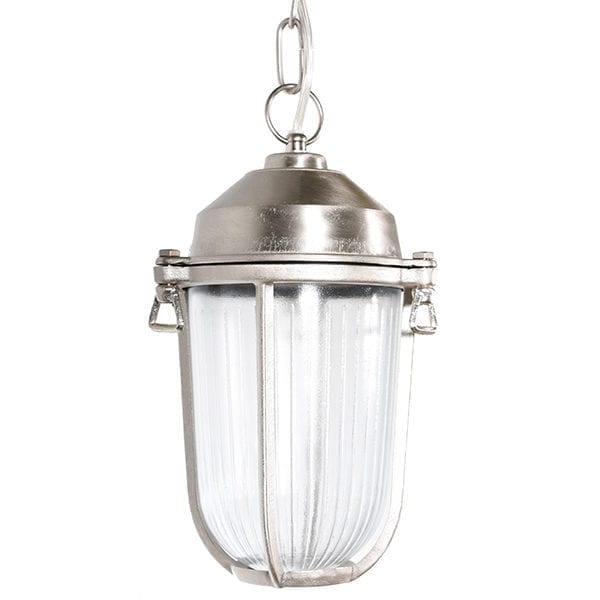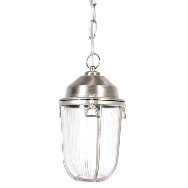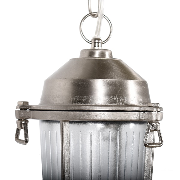 Schöne hängende Deckenlampe im Marinestil. Manacor ist aus Messing gefertigt, das matt vernickelt wurde, und hat ein klares Glas. Sie ist gut verarbeitet und eine unglaublich langlebige Deckenlampe, da sie aus einem so soliden Material hergestellt ist. Die Kette ist 70 cm lang und die Lampe selbst ist 22,5 cm lang. Die Lampe hat eine dekorative Kette und eine Mutter, mit der Sie das Laternengitter, das das schöne Glas hält, anschrauben. Diese Deckenlampe ist schön in einem Außenraum, auf der Veranda oder vielleicht in der Außenküche. Die Deckenleuchte hat IP 64