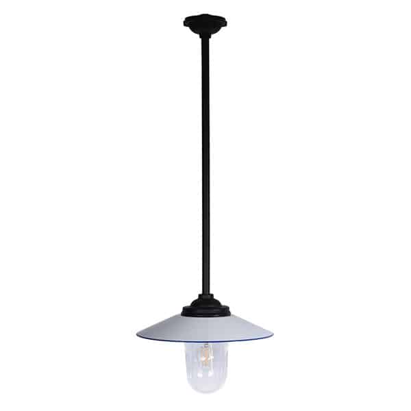 Laterne aus Gusseisen mit emaillierten und kupfernen Schirmen. Der weiße Schirm ist weiß emailliert mit dunkelblauen Streifen. Der schwarze Schirm hat eine weiße Rückseite mit einem schwarzen Streifen. Der Kupferschirm ist poliert und nicht behandelt. Hergestellt nach einem alten Modell aus den 1900er Jahren. Übliche Außenlampe in Schweden und Europa in dieser Zeit, eine der gängigsten. IP44 CE-gekennzeichnete Sicherheit geerdet.