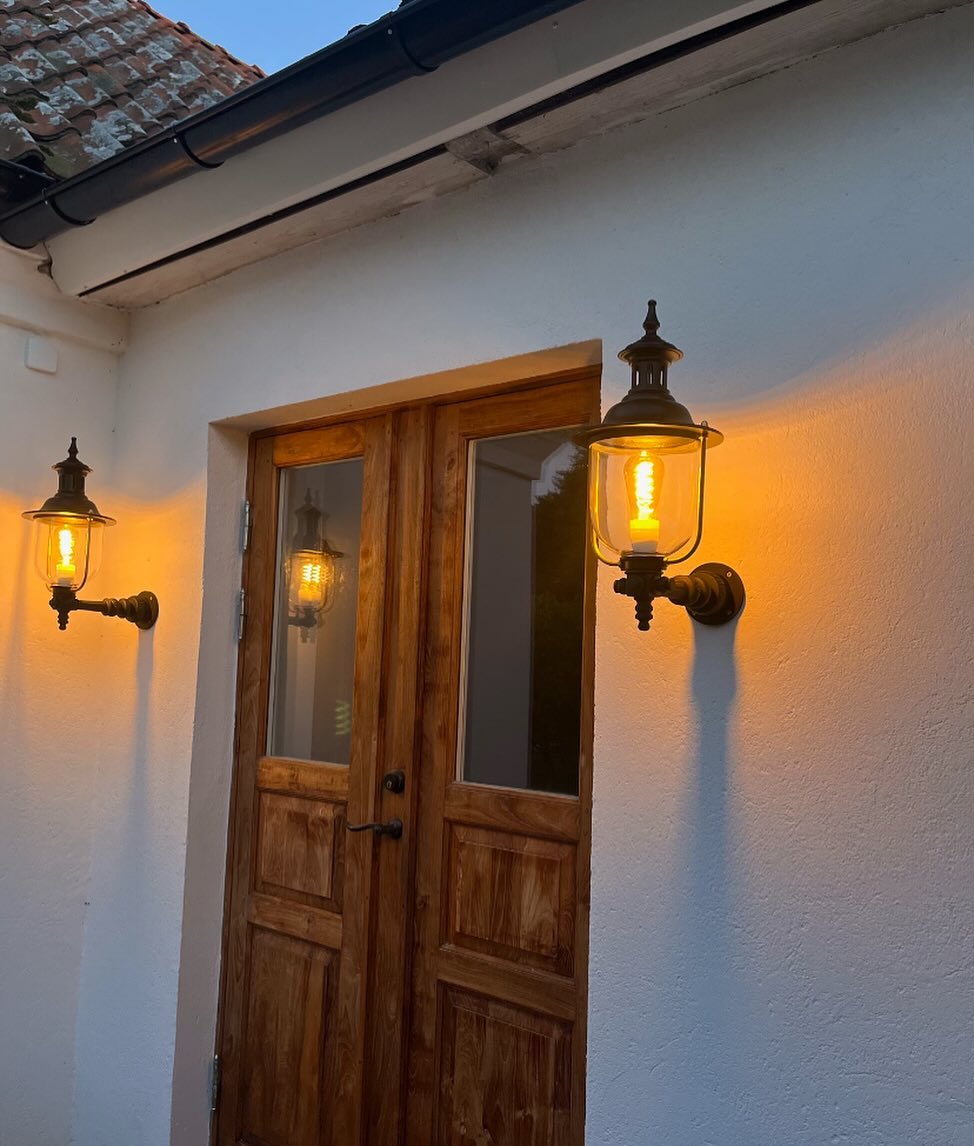 Unsere Wandleuchte ist aus einem soliden Material gefertigt und vollständig in Messing gegossen. Das Design ist an Modelle aus der Jahrhundertwende angelehnt, was einen zeitlosen Stil ergibt, an dem man sich nicht satt sehen kann. Eine Fassadenbeleuchtung, die sowohl zum Schloss als auch zur Hütte passt.