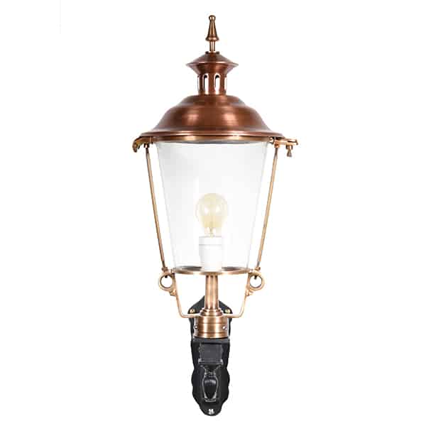 Die Außenleuchte ist aus massivem, handgegossenem Aluminium gefertigt, wodurch sie sich leicht an der Wand befestigen lässt. Die Wandlaterne hat eine Abdeckung aus Kupfer, Messing auf andere Details. Die Wandleuchte ist beliebt, weil das Material nicht rostet und sie so wartungsfrei ist, eine Leuchte für Generationen!